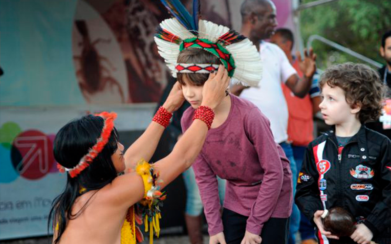 Foto destaque: Indígena realiza atividade com crianças durante o 69º encontro anual da SBPC (Reprodução/Raíssa César/UFMG)